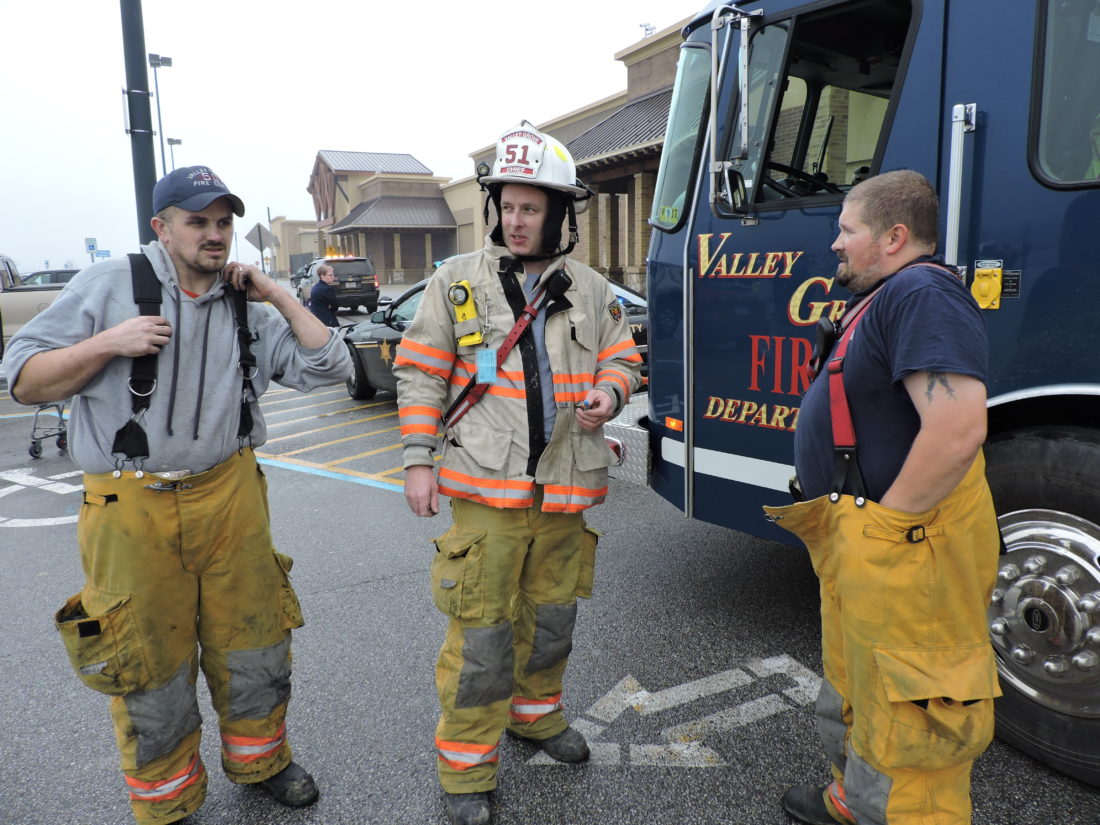Photo by Janet Metzner Valley Grove Volunteer Fire Department Chief Scott Himrod, center, and firefighters Craig Blacker, left, and Chris Oliver, finish up a call at Walmart at The Highlands on Jan. 2 after a vehicle fire spread to multiple vehicles.