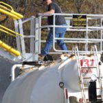 Photo by Casey Junkins An employee works on a “sand can” truck, which is used to transport sand to Marcellus and Utica shale natural gas fracking sites, at the Transload Solutions site in Benwood.