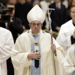 Pope Francis leaves after celebrating a new year Mass in St. Peter's Basilica at the Vatican, Tuesday, Jan. 1, 2019. Francis celebrated Mass Tuesday in St. Peter's Basilica to formally open 2019. In his homily Francis urged Catholics to allow themselves to be led again as children are led by their mothers. (AP Photo/Andrew Medichini)