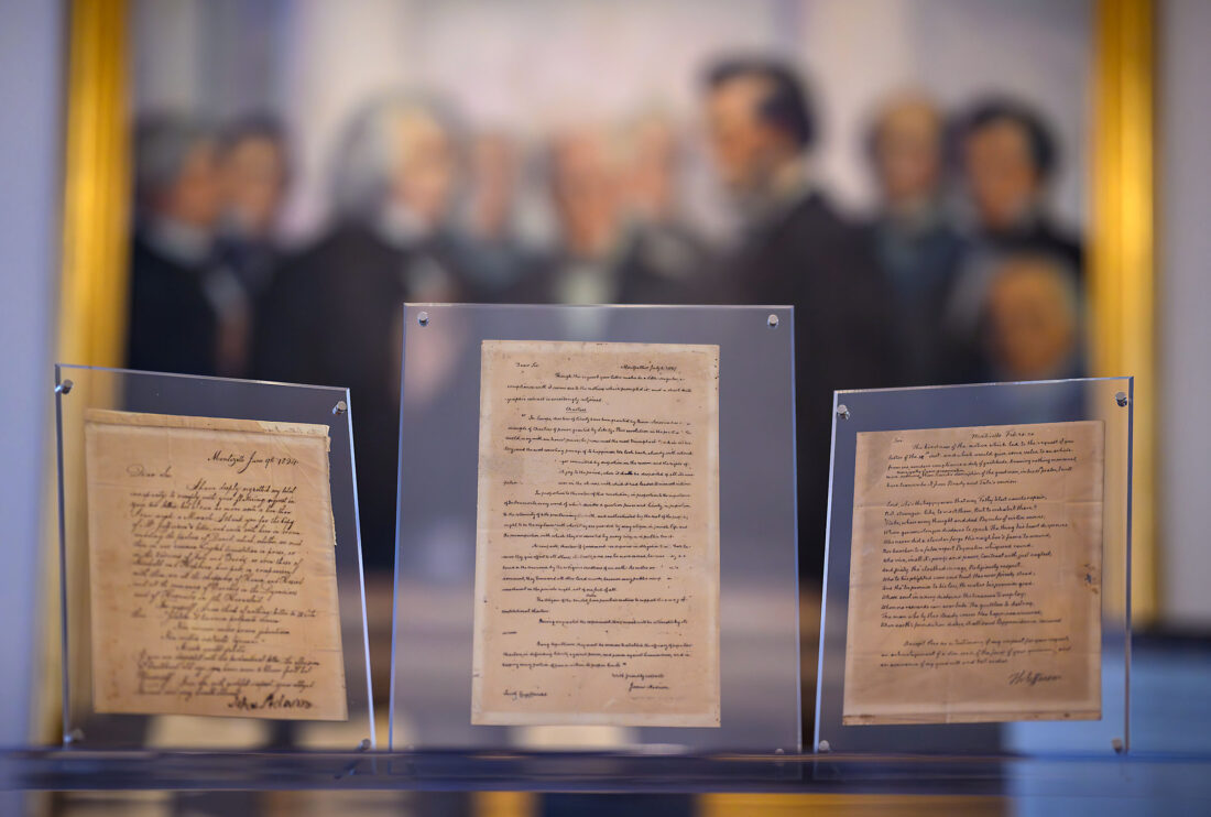 Letters written to Jacob Engelbrecht by former presidents, John Adams, left, James Madison and Thoams Jefferson.