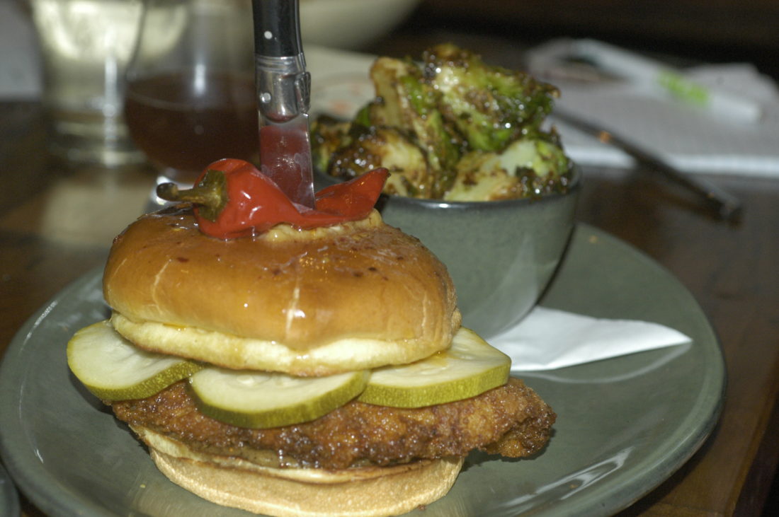Shown is a spicy chicken sandwich with bread-and-butter zucchini and a side of carmelized Brussels sprouts at Rockmill Tavern in downtown Columbus.