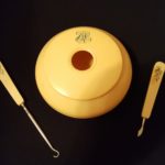 A friend of mine came across a “what is it” antique and called me to take a look at the strange little dish she inherited not long ago. The monogramed bowl was made of a plastic-like ivory material and seemed to go with two small tools.
