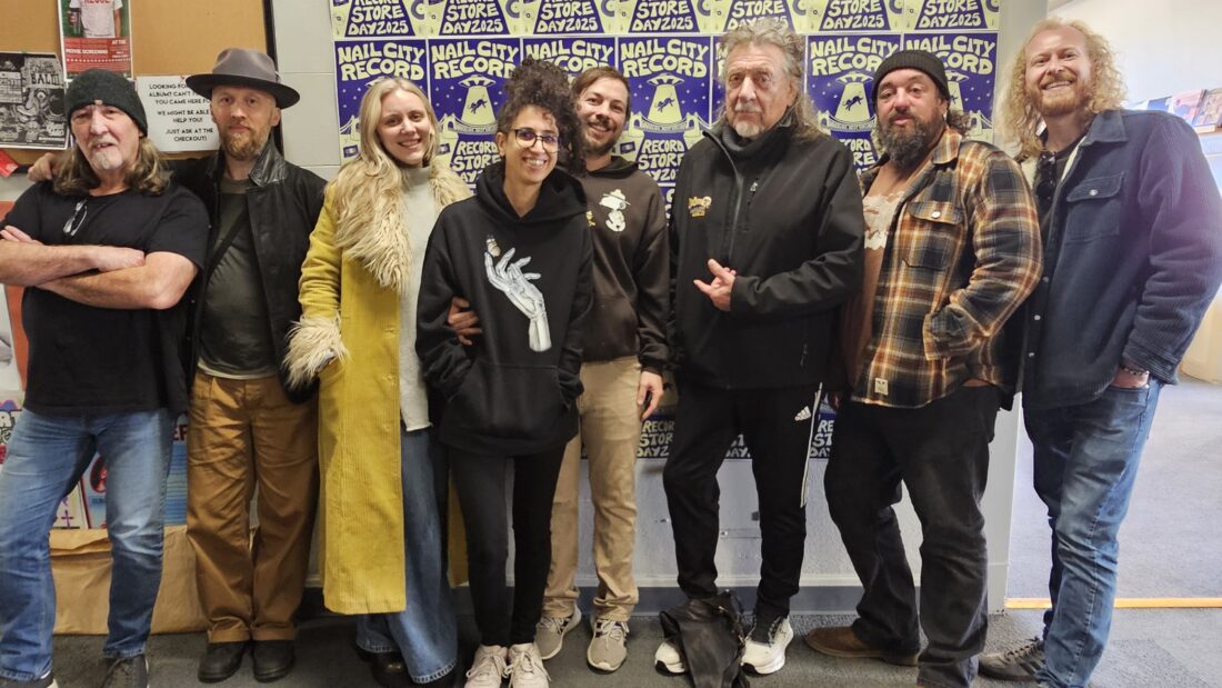 Robert Plant and the entire Saving Grace band dropped by Nail City Record in downtown Wheeling this week before their show at the Capitol Theatre. From left are Saving Grace members Tony Kelsey, Barney Morse-Brown and Suzi Dian; Nail City Record’s Molly and Jon Napier; Plant, and Saving Grace’s Matt Worley and Oli Jefferson. (Photo Provided by Nail City Record)
