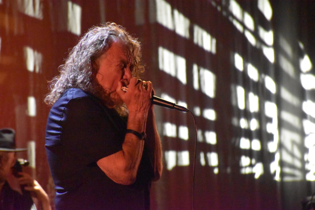 Robert Plant plays the harmonica during a performance with Saving Grace on Oct. 30, 2025 at the Capitol Theatre in Wheeling. (Photo by Eric Ayres)