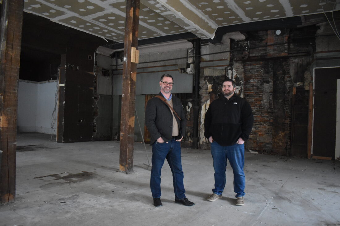 Principal Chris Clark and Project Manager Logan Patrick, from left, of The Mills Group stand inside the first floor of the historic Egerter Building on Market Street in downtown Wheeling. This area, where most recently a Subway store operated before scores of other businesses over the past century, is expected to be the home to The Mills Group’s Wheeling offices later this year. (Photo by Eric Ayres)
