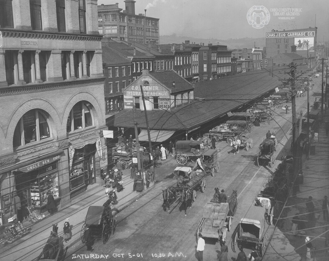 This archival photo provided by the Ohio County Public Library shows a bustling area along Market Street in downtown Wheeling around the turn of the century between the late 1800s and early 1900s when horse drawn carriages were the prominent mode of transportation. The Egerter building on the left is shown adjacent to the old market house that once stood in the area where the Plaza on Market is today. (Photo Provided)