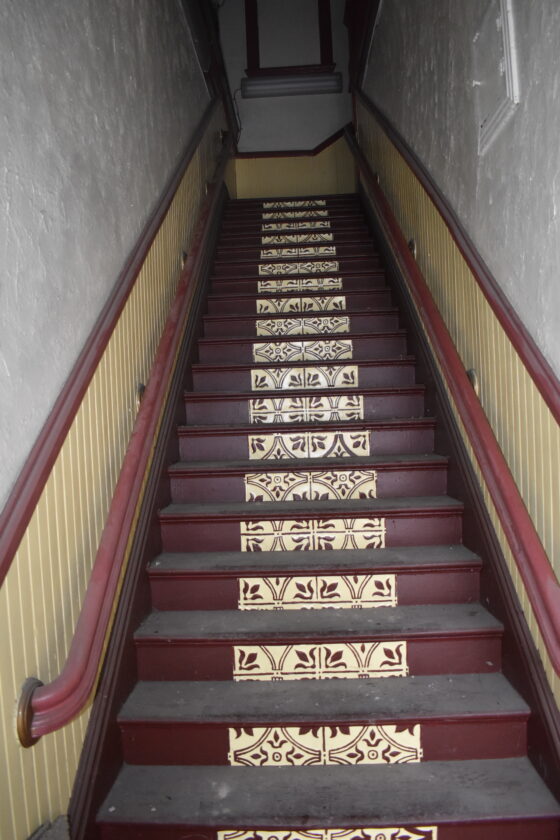 The ornate stairs leading to the upper floors of the Egerter Building are one of the many architectural features that still exist inside the historic facility. (Photo by Eric Ayres)