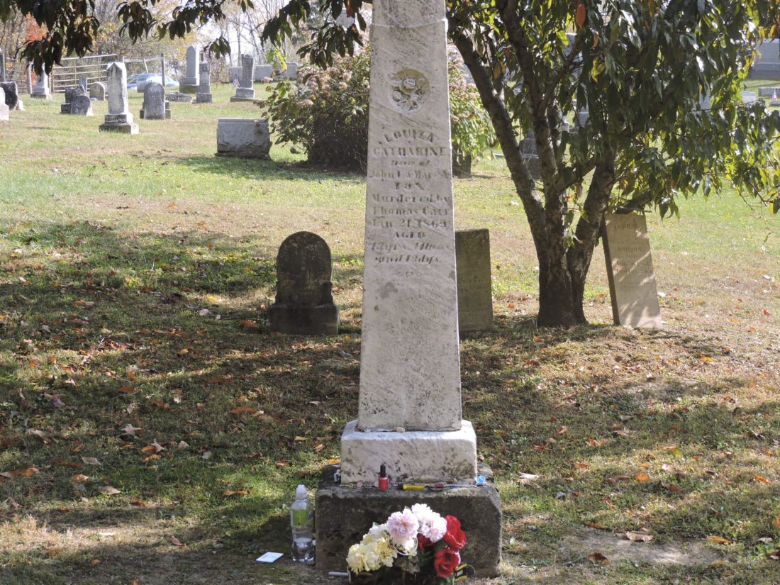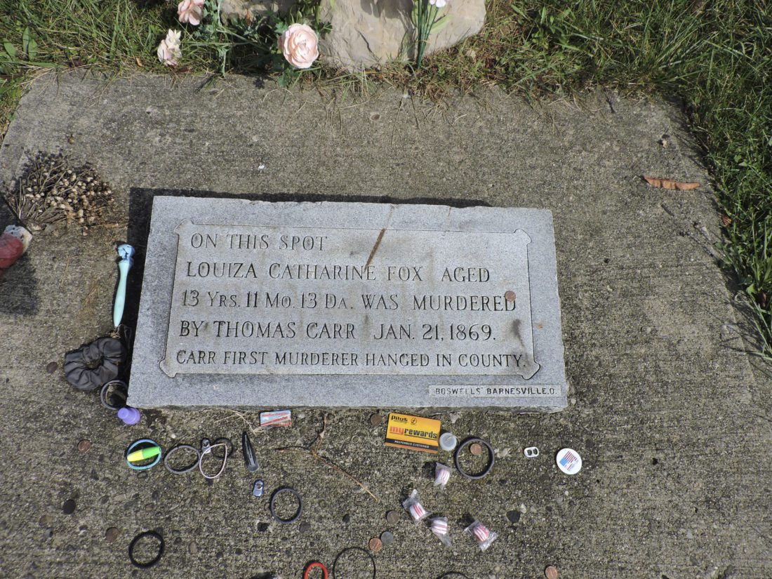 The gravestone of Louiza Catherine Fox in Salem Cemetery. Fox was murdered by her lover, Thomas Carr, who was charged with her death and became the first man hanged in Belmont County.