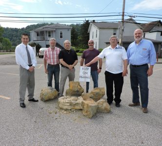 Martins Ferry city leaders and other officials stand near the prayer rocks at one of the East Ohio Regional Hospital parking lots Monday morning during a press conference held there. From left are Vince Gianageli, the Rev. William Webster, Service Director Andy Sutak, Water Superintendent Bill Suto, Mayor John Davies and Pease Township Trustee Mike Bianconi.