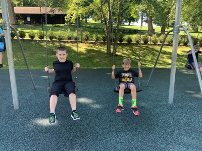Nathan Weaver, left, and Trevor Hinerman swing on the playground Wednesday after the camp opened this week.