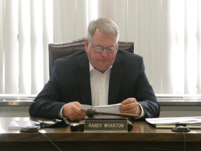 Photo by Joselyn King Ohio County Commission President Randy Wharton presides over Tuesday night’s commission meeting.