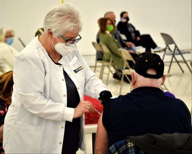 Photo by Scott McCloskey Linda Shelek, a nurse practitioner, administers a COVID-19 vaccine during a clinic at the Ohio County Health Department’s vaccine site at The Highlands in Ohio County.