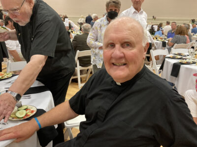 Msgr. Jeremiah McSweeney sits down for dinner during his Golden Jubilee celebration at St. Michael Catholic Church in Woodsdale.