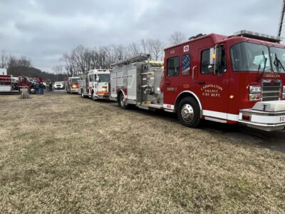 Photo Provided - This photo shared on the Tiltonsville Volunteer Fire Department’s Facebook page shows fire engines from a variety of fire departments from throughout the state lined up to form a perimeter to help protect structures endangered by the train derailment in East Palestine.