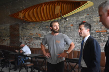 U.S. Transportation Secretary Pete Buttigieg speaks with Dan Milleson, left, owner of the Waterfront Hall under development in the former Berry Supply building on Water Street during a visit in July. Wheeling Mayor Glenn Elliott listens at right.