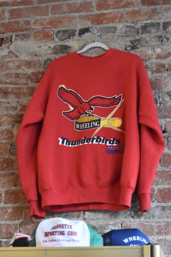 Outdated Threads carries unique vintage treasures like this classic, hard-to-find Wheeling Thunderbirds sweatshirt. (Photo by Eric Ayres)