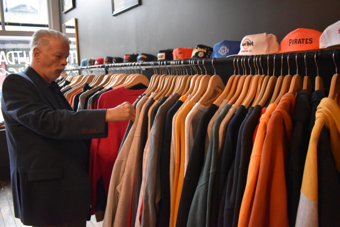 The Wheeling Area Chamber of Commerce’s Mike Howard scours the sweatshirt racks at Outdated Threads in search of old-school treasures. (Photo by Eric Ayres)