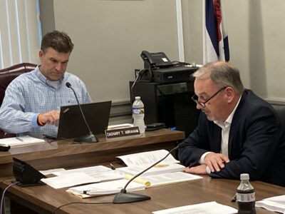 |Photo by Joselyn King| Ohio County Commissioner Zach Abraham, left, listens as County Administrator Randy Russell discusses county business before the commissioners.