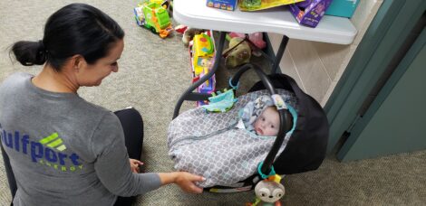 Gulfport Energy employee Jessica Marlow watches over baby Caden, who paid a visit to the Toys for Tots giveaway on Thursday at First Presbyterian Church in St. Clairsville.
