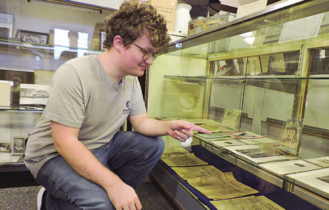 Trent Dayton, Americorps member with the Marshall County West Virginia Historical Society, points out artifacts in the Marshall County History Museum’s new 1919 Moundsville High School time capsule display.