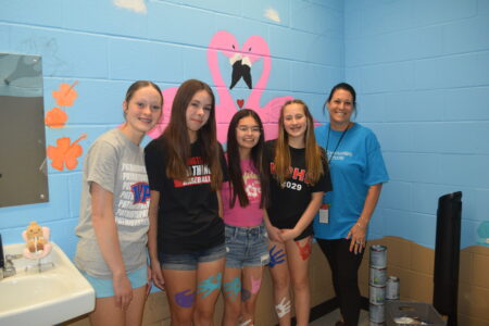 Middle schoolers Rianna Farrow, Lillian Wood, Chloe Pollard and Lily Tennant recently were hard at work in the bathroom. The girls said they had a poll where they asked for feedback on which theme to select for this second bathroom. The overwhelming response was a beach theme complete with flamingos, a turtle, tropical flowers and other creatures.