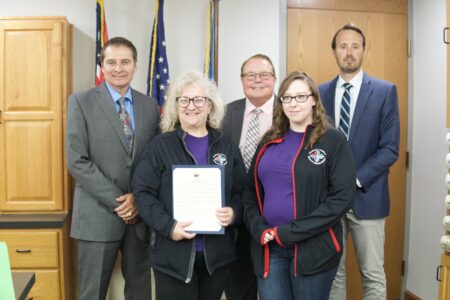 Photo by Gage Vota Belmont County Commissioner Vince Gianangeli from left, Belmont County WIC Department Director Lori DeCoy, Belmont County Commissioner Jerry Echemann, Belmont County WIC Department Breastfeeding Peer Helper Krysila Baratie, and Commissioner J.P. Dutton pose with the proclamation declaring August to be Breastfeeding Awareness Month.