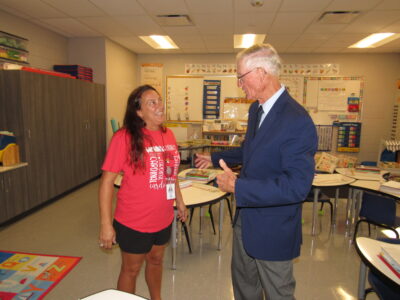 Sand Hill Elementary School kindergarten teacher Tena Stricklin talks with Marshall County Board of Education President John Miller inside her classroom on Friday. A ribbon cutting ceremony was held for the new school.
