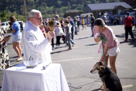 MARTINS FERRY — “Blessed are you, Lord our God, in all your creatures,” the Rev. John Mucha of St. Mary Catholic Church said before blessing several residents’ pets behind the church Friday after students attended Mass.