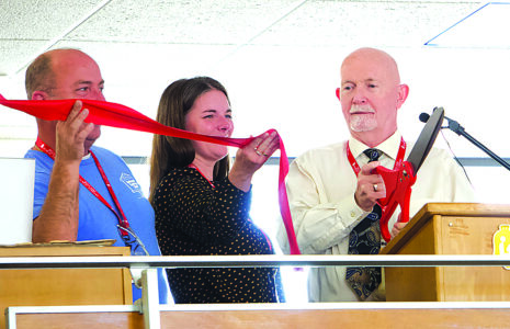 Bellaire Public Library Board of Trustees member Troy Johnson, from left, vice president Kelli Shallcross watch president Ron Marling cut the ribbon marking the grand opening of the library’s Local History Center and Bellaire Room.