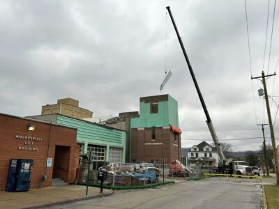 A crane is used to install steel beams earlier this year during the construction of the Moundsville Municipal and Safety Building. (Photo Provided)