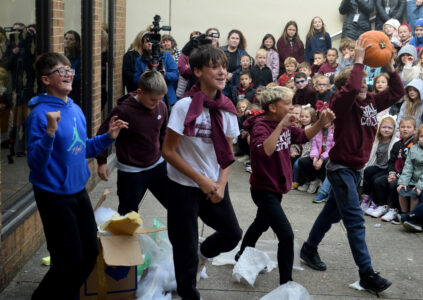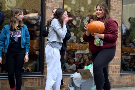 The student body looks on as St. Michael Parish School Principal Adrienne Lewis throws a box with a pumpkin protected inside off the roo