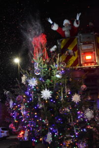 - Santa Claus uses his magic dust to light the Christmas tree in The Market on Plaza on Wednesday night, utilizing an aerial ladder truck from the Wheeling Fire Department for his dramatic arrival to Winter on the Plaza. (Photo by Eric Ayres)