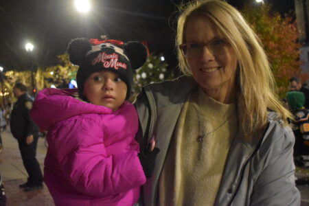 - Beth Hinebaugh of Wheeling holds 2-year-old McKenzie Summers of Martins Ferry as they eagerly await the arrival of Santa Claus Wednesday night at Winter on the Plaza. (Photo by Eric Ayres)