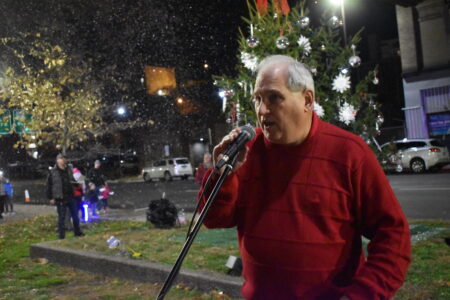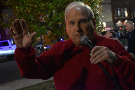 - Wheeling Mayor Denny Magruder welcomes the crowd at Winter on the Plaza on Wednesday night and gets the children fired up for the arrival of Santa. (Photo by Eric Ayres)
