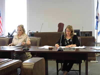 Photo by Craig Howell Brooke County Commissioners Christina White, left, and Stacey Wise discussed a variety of topics during Tuesday's commission meeting, including determining awards from the county's portion of opioid settlement funds.