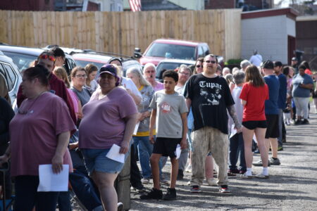 - Hundreds of local people of all ages gathered outside the North Wheeling Community Dream Center on Saturday for the Bethlehem Apostolic Temple’s annual Easter food distribution. (Photo by Eric Ayres)