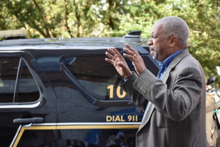 Bishop Darrell Cummings, pastor of the Bethlehem Apostolic Temple, offers a prayer before the start of the annual Easter food distribution with the crowd gathered outside the North Wheeling Community Dream Center on Saturday. (Photo by Eric Ayres)