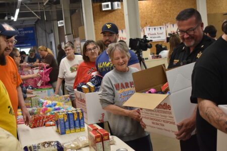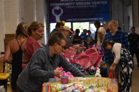- Volunteers from all walks of life helped with Saturday’s distribution of holiday food, Easter baskets and more at the North Wheeling Community Dream Center. (Photo by Eric Ayres)