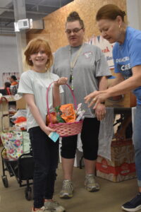 - Charlee Hott, 8, of Wheeling, makes sure her Easter basket has a well-balanced assortment of chocolate, candy, onions and baby carrots. (Photo by Eric Ayres)