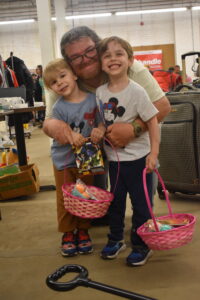 - Justin Guglielmotti of Rayland helps 4-year-old Greg Dickey and 5-year-old Alex Dickey fill up their Easter baskets during Saturday’s event. (Photo by Eric Ayres)
