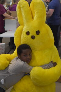 - Amir Jones, 5, shows some love for the hard-working Peeps Easter Bunny Saturday during the Bethlehem Apostolic Temple’s annual Easter food distribution at the North Wheeling Community Dream Center. (Photo by Eric Ayres)