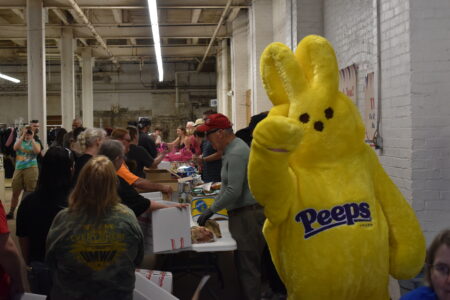 - The Peeps Easter Bunny welcomed everyone who came through the doors of the North Wheeling Community Dream Center during Saturday’s holiday food distribution. (Photo by Eric Ayres)