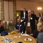 Photo by Shelley Hanson West Virginia University President Gordon Gee, center, talks with WVU Alumni President Sean Frisbee, second from left, Tuesday at Oglebay Park. At left is Noah Doak, 17, and his parents Jeff and Carrie Doak, of Senecaville.