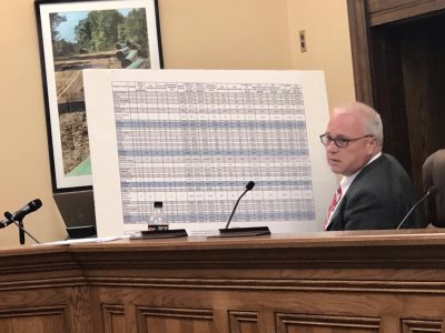 Delegate Gary Howell, R-Mineral, shows on a chart the county-by-county caseloads for Child Protective Services workers.
