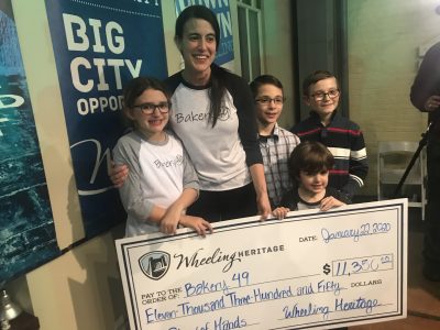 Corey Kidd, owner of Bakery 49, celebrates after winning the Show of Hands competition Wednesday night in Wheeling. Kidd took home a check for $11,350. Pictured from left are Kidd’s daughter, Carter Kidd, Corey Kidd, her son Carson Kidd, Jude Veltri and Brooks Wharry.