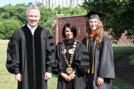 Wheeling Mayor Glenn Elliott, left, served as the speaker at Wheeling University’s 62nd Commencement Ceremonies. He’s shown with Wheeling University President Ginny Favede, center, and class valedictorian Kenzie Schroer.