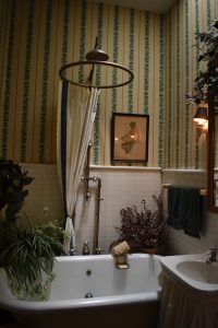 - The Eckhart House’s original 1892 shower and bath tub are still present in the house, vintage features that are both decorative and functional. (Photo by Eric Ayres)
