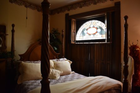 Decorative colored glass windows are among the eye-popping highlights of the Eckhart House. (Photo by Eric Ayres)