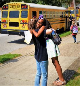 - Photo by Scott McCloskey Middle Creek Elementary School first grader Chloe Brown is greeted by teachers and faculty shortly after getting off a school bus in front of the school Wednesday morning.