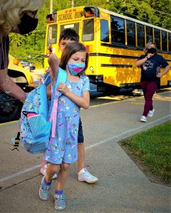 Middle Creek Elementary School first grader Chloe Brown is greeted by teachers and faculty shortly after getting off a school bus in front of the school Wednesday morning.